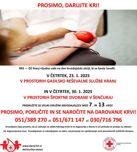 Območno združenje Rdečega križa Kranj vas vabi, da se pridružite družini krvodajalcev in se udeležite ene od januarskih terenskih krvodajalskih akcij, ki bosta: