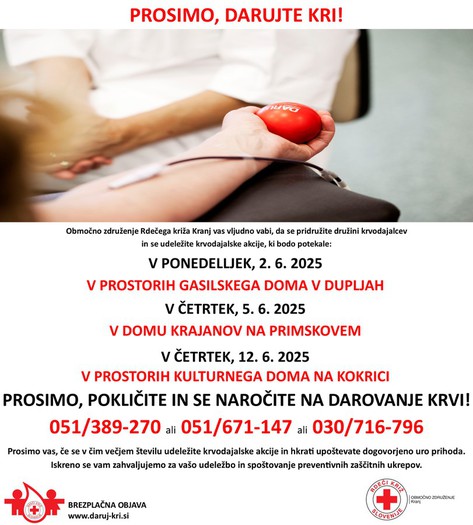 Odvzemi krvi bodo v času od 7.00 do 13.00. Za darovanje krvi, vas prosimo da predhodno pokličete